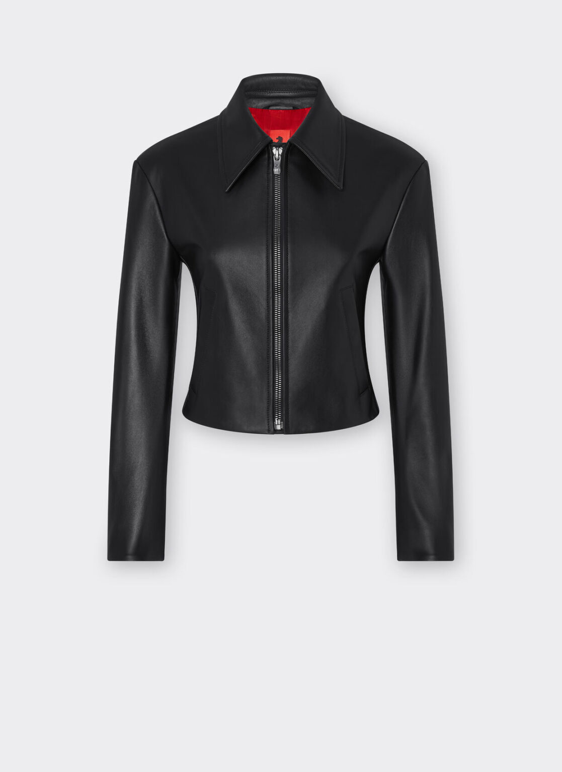 Cropped and shaped biker jacket, enhanced by the construction on the back that recalls the profile of the iconic Ferrari rear window. The classic collar and zips on the front and at the bottom of the sleeves define the contemporary lines of this Made in Italy model.